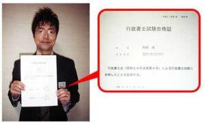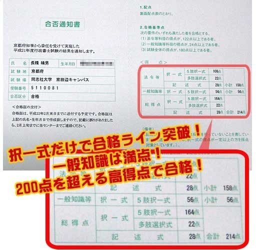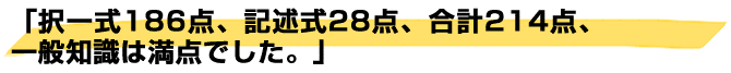 受験後の自己採点では200点は超えていると思いましたが、正式発表までは不安でした。1月25日の合格発表で、見事合格。26日に正式通知が届き、 択一式186点、記述式28点、合計214点、一般知識は満点でした。