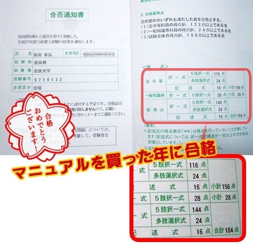 自己採点では記述以外で168点でしたので、何とか合格できるかなとは思っていましたが、行政書士試験研究センターのホームページで、自分の受験番号を見つけたときには、信じられませんでした。本当に1年間マニュアルを信じて勉強して良かったと思いました。