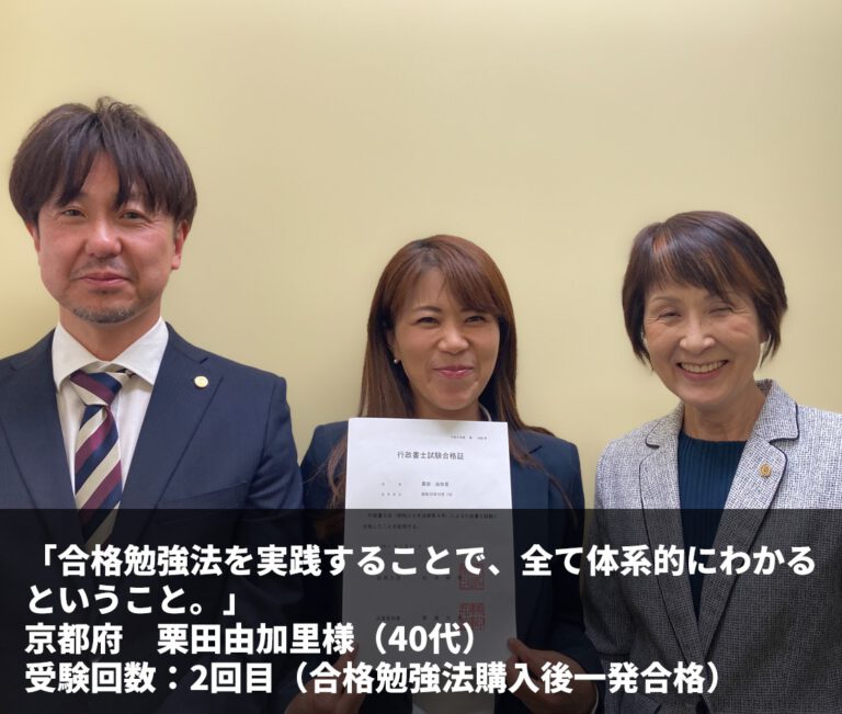 『合格勉強法を実践することで、全て体系的にわかるということ。』 京都府 栗田 由加里 様(40代) […] -