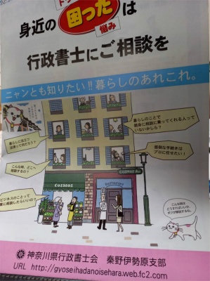 ・神奈川県行政書士会秦野伊勢原支部会員として、秦野市役所にて毎月第4月曜日に行政書士無料相談会(人権・広聴相談課)を開催し、当番制で対応しています。