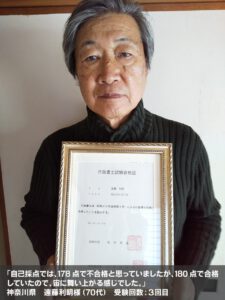 合格した瞬間の感想ですが、テスト当日、自己採点で記述の採点次第という危うい結果に、もう1回かなぁ?と思い、(不合格と思って)通知書を開いたところ、合格の文字を見て、涙が出そうになりました。