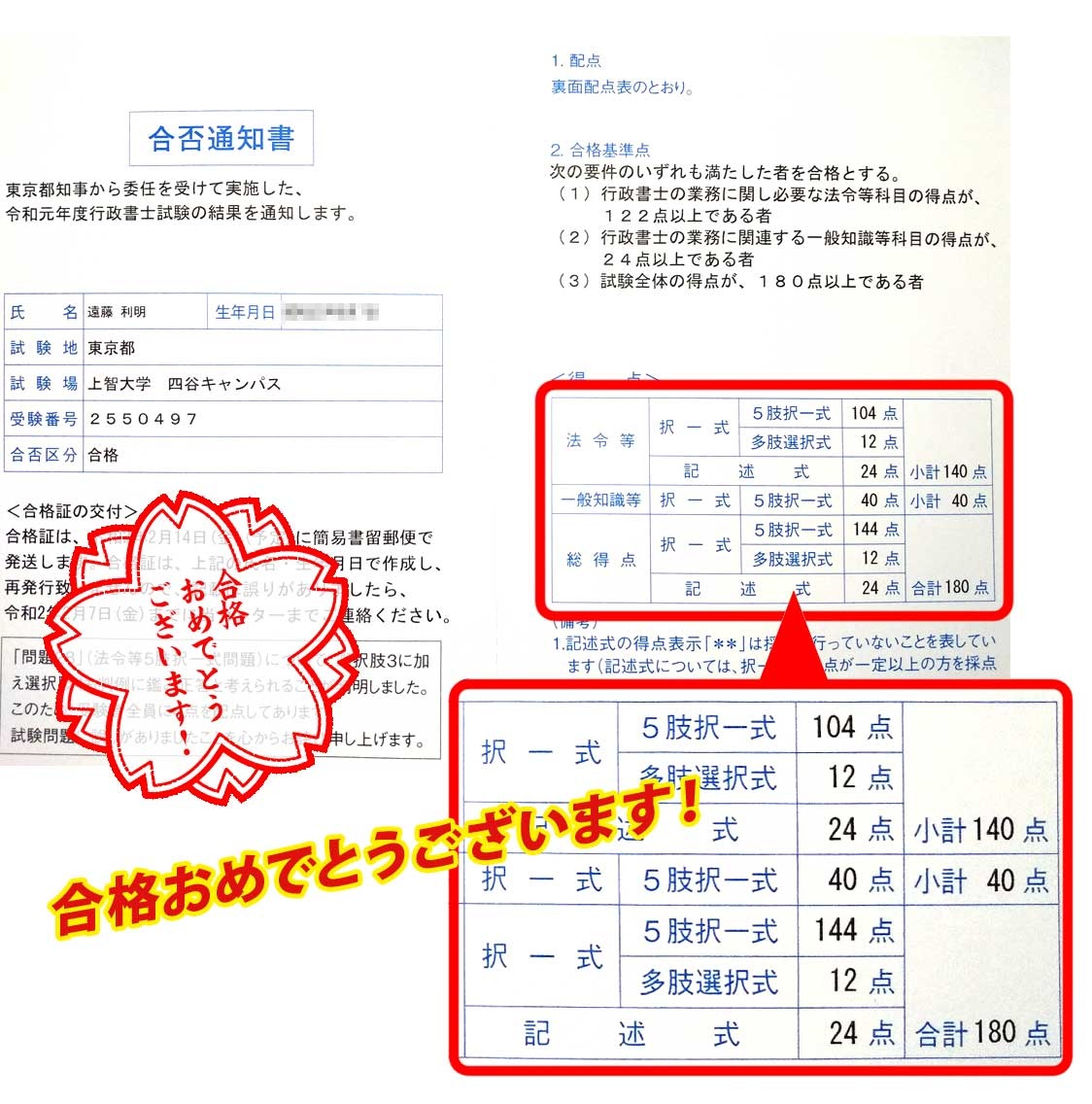 自己採点では、178点で不合格と思っていましたが、180点で合格していたので、宙に舞い上がる感じでした。
